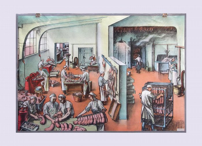 Wurstfabrik. ca. 1950. Farbiger Offsetdruck. Bildformat: 94 x 64 cm. + Wichtig: Für unsere Kunden in der EU erfolgt der Versand alle 14 Tage verzollt ab Deutschland / Postbank-Konto in Deutschland vorhanden +, Abb. Schulwandbild.