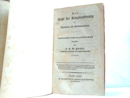 Das Recht der Kriegseroberung in Beziehung auf Staatscapitalien. Nach Grundsätzen des Privat- und Völker-Rechts dargestellt Hannover/Cassel, Hahnsche Hofbuchhandlung, 1823. XIV/362 S., original Pbd. (berieben und bestossen/etwas stockfleckig/Name auf Vorsatz)--- - Erste und einzige Ausgabe des staatsrechtlichen Werkes des liberalen Juristen Pfeiffer (1777 - 1852) -.