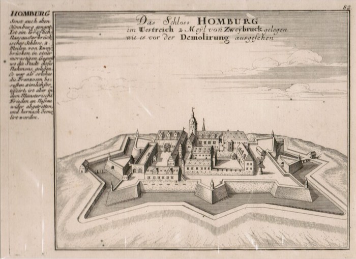 Blick auf das ehemalige Renaissance-Schloß in Homburg / Saar. um, Kupferstich von Bodenehr, 1720. 15,5x22 cm (inklusive kleiner Legende am Bildrand links).
