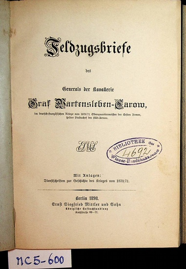 Feldzugsbriefe des Generals der Kavallerie Graf Wartensleben-Carow, im deutsch-franz?sischen Kriege von 1870/71 Oberquartiermeister der Ersten Armee, sp?ter Stabschef der S?d-Armee. Mit Anlagen: Dienstschriften zur Geschichte des Krieges von 1870/71. Berlin, Ernst Siegfried Mittler und Sohn K?nigliche Hofbuchhandlung, 1898. Leinenband der Zeit, 8?, VIII, 223 Seiten; Zustand: Exemplar mit Bibliotheksstempel, gut +.