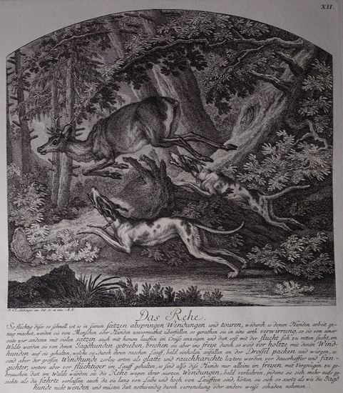 "Das Rehe." Aus der Folge "Die von verschiedenen Arthen der Hunden behaetzte Jagtbare Thiere" von Johann Elias Ridinger, Bl. XII. Augsburg o.J. (1761). Original-Druck der Zeit. Kupferstich auf schwerem Büttenpapier, in der Platte signiert "J. El. Ridinger inv del sc et exc. A.V." Schöner gradiger Abdruck, tiefe Schwärze. Format: Blatt 49,3 x 34,3 cm; Platte 28,6 x 25 cm; Darstellung 21,5 x 23,3 cm. -- Zustand: Papier leicht gebräunt und etwas fleckig. Werkverzeichnis Thienemann 151. -- Über Johann Elias Ridinger (Quelle: wikipedia): Johann Elias Ridinger (* 15. Februar 1698 in Ulm; gest. 10. April 1767 in Augsburg) war ein deutscher Tiermaler, Kupferstecher, Radierer und Verleger. Leben: Ridinger wurde als Sohn eines zeichnerisch begabten Vaters von Christoph Rasch (auch Resch) in Ulm und Johann Falch (auch Falk) in Augsburg unterrichtet und bildete sich dann in Regensburg weiter, wo ihn seine Vorliebe für die Jagd zum Studium des Wildes am Hof des Grafen Metternich hinführte. Nach 1717 unternahm er weitere Studien in der reichsstädtischen Akademie des Georg Philipp Rugendas. Er gründete später in Augsburg einen eigenen Kunstverlag, in dem die meisten seiner Werke erschienen. 1759 wurde er Direktor der Kunstakademie. Ridinger starb am 10. April 1767 in Augsburg. Sein Werk wurde von seinen Söhnen Martin Elias (1730-1780) und Johann Jakob (1735-1784) weitergeführt. Der Verlag wurde später von der Martin Engelbrechtschen Kunsthandlung übernommen und 1827 von Johann Alois Schlosser. Werk: Seine radierten Blätter, die sich auf etwa 1600 Stück belaufen, stellen die Tiere in charakteristischen Lebensmomenten und landschaftlichen Umgebungen dar. Alte Abdrucke der Blätter sind selten. Eine Ausgabe als "Galerie Ridingerscher Tier- und Jagdstücke" wurde 1817 in Augsburg begonnen. Sehr zahlreich sind seine mit Genauigkeit und Geschmack ausgeführten Zeichnungen. -- Auswahl seiner Kupferstichfolgen: Neue Reitkunst in Kupferstichen inventiert & gezeichnet, Augsburg 1722, 22 Blatt // Betrachtung der wilden Thiere, mit beygefügter vortrefflichen Poesie des hochberühmten Herrn Barthold Heinrich Brockes, Aug. Vindelic. 1736 // Entwurff einiger Thiere, wie solche nach ihren unterschiedenen Arten, Actionen und Leidenschafften, nach dem Leben gezeichnet, samt beygefügten Anmerckungen, Teil 1 (1738), Teil 2 (1738), Teil 3 (1738), Teil 4 (1740), Teil 5 (1740), Teil 6 (Entwurf einiger Pferde, nach ihrem unterschiedlichen Alter und Gebrauch nach dem Leben gezeichnet, 1746), Teil 7 (Entwurff einiger Maul-Thiere und Esel, nach ihren unterschiedlichen Arten und Gebrauche nach dem Leben gezeichnet, 1754), 90 Blatt // Abbildung der jagtbaren Thiere mit derselben angefügten Fährten und Spuhren, Wandel, Gänge, Absprünge, Wendungen, Widergängen, Flucht, und anderer Zeichen mehr mit vielem Fleiss, Zeit und Mühe nach der Natur gezeichnet, samt einer Erklärung darüber, Augsburg 1740 // Die Parforcejagd des Hirschen, 16 Blatt // Vorstellung und Beschreibung derer Schul- und Campagne Pferden nach ihren Lectionen, 1760, 46 Blatt // Genaue und richtige Vorstellung der wundersamste Hirsche sowohl als anderer besonder Thiere, welche von großen Herren selbst gejagd, geschoßen, lebendig gefangen oder gehalten worden, Augsburg 1768, 100 Blatt.
